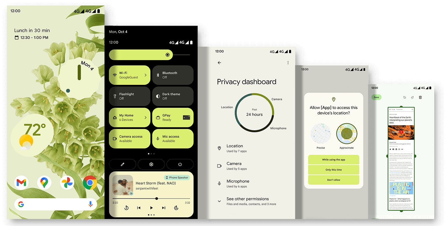 ОС Android 12 стал ещё более персонализированным за счёт настройки визуальных эффектов. Безопасность и конфиденциальность улучшены, а скорость загрузки приложений стала ещё выше.