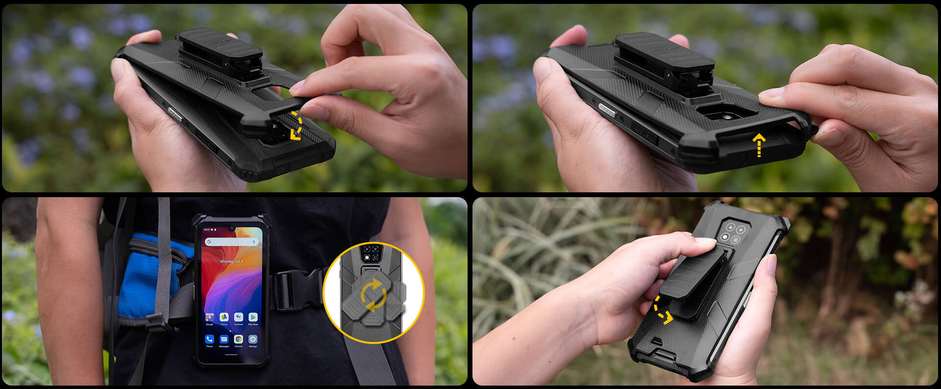 В чехле присутствует клипса, которая поворачивается на 180°, также можно установить крепление для карабина. С чехлом смартфон стал более портативным.