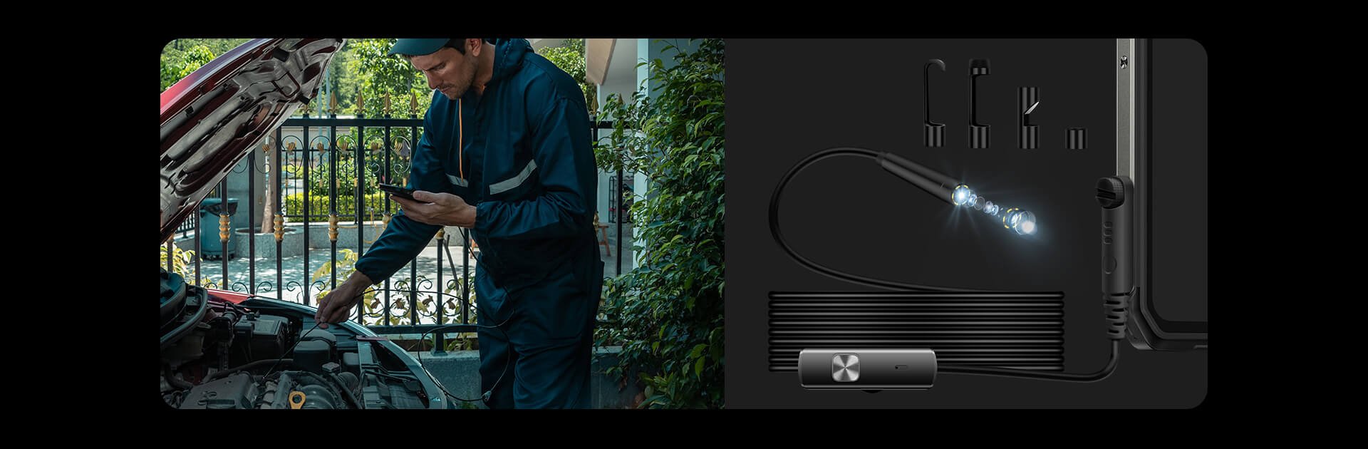 В комплекте присутствует зеркало для увеличения угла обзора, крючок для захвата предметов, магнит для металлических предметов, защитный чехол для защиты камеры эндоскопа.