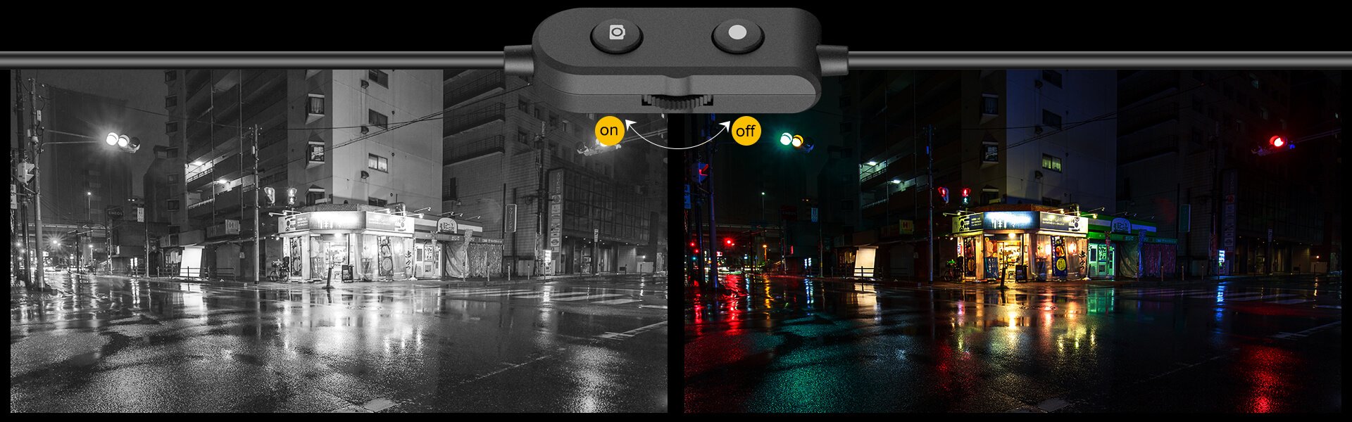 Вы можете управлять яркостью ИК подсветки, переключать режим с ночной съёмки на полноцветную в режиме слабого освещения. С помощью переключателя на кабеле, ВКЛ/ВЫКЛ ИК подсветку, делайте кадры, запускайте/останавливайте видеозапись. Также управляйте через приложение.