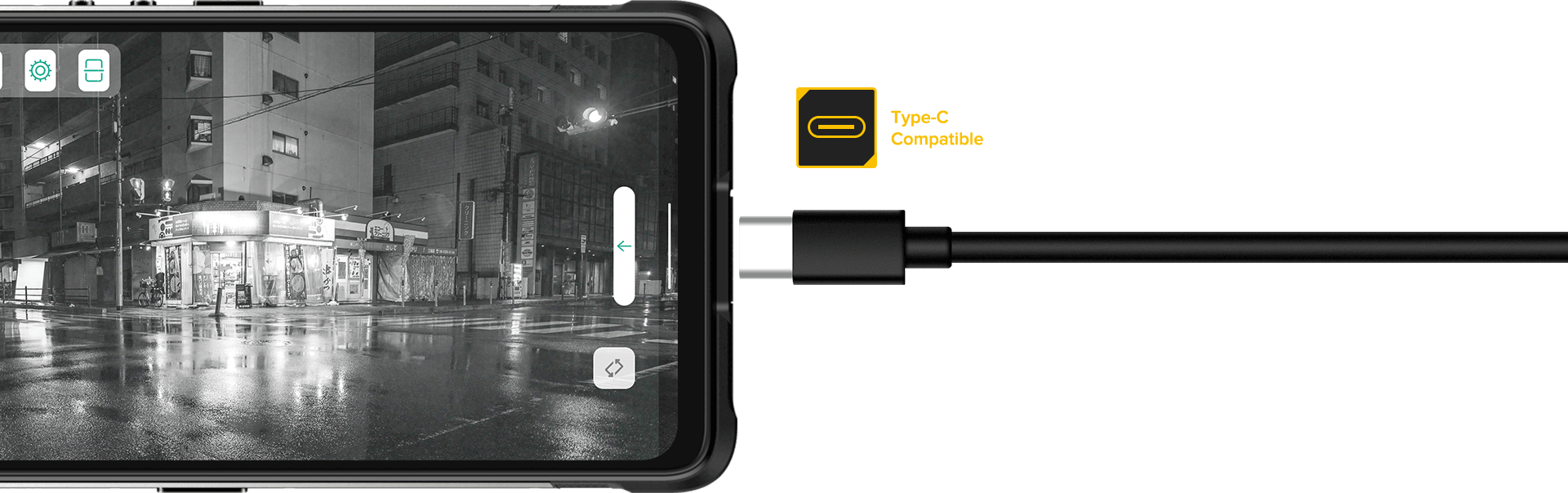 Камера ночного видения подключается через интерфейс USB Type-C. После подключения, автоматически запускается приложение камера. Совместимость с ОС Android 7.0 или новее, необходима поддержка OTG*.